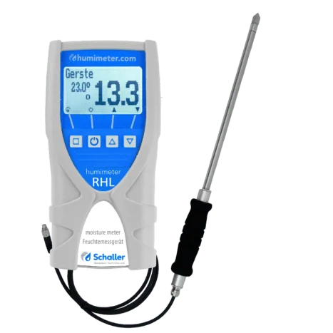 The basic device humimeter RHL offers the possibility to connect different humidity sensors. The penetration probe can be manufactured in lengths between 300 and 2000 mm, depending on requirements. The standard length is 300 mm. With the lance, moisture measurement is also possible in deeper layers of the warehouse. With the additionally connectable aw value measuring chamber, it is also possible to measure small sample quantities.