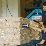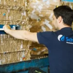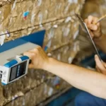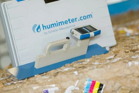 Start up your humimeter RP6 by pressing the black button on the handle of the measuring device. Select the appropriate characteristic curve on the device (e.g. 350 waste paper) and hold the measuring plate against the waste paper bale. Moisture and temperature can now be read on the display. You now have the option of saving the measuring result and adding additional information such as supplier data and notes. This measurement data can now be transferred to your PC or printed out directly on site using the optionally available portable measured value printer.