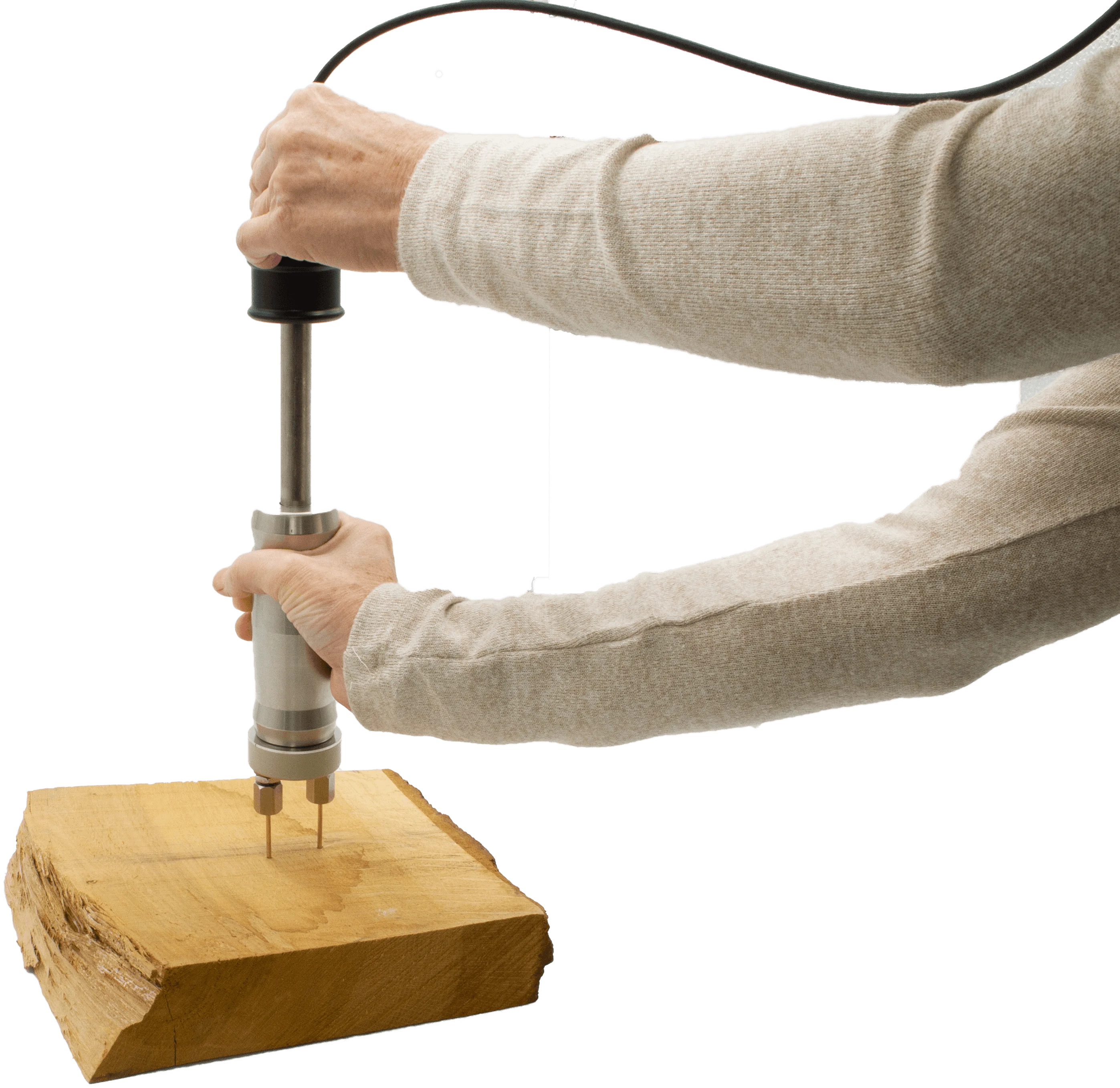 Choose a part of the wood WITHOUT bark, branches, pitch pockets or cracks. Switch on the humimeter WLW wood moisture meter, plug in the sensor cable into the socket and fix the plug by turning the screw connection. Select the right wood type and drive the ram electrode in the right angle to the grain into the wood.