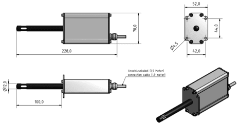 As Standard version, the moisture and temperature values are output via analogue 4-20mA power output. Alternatively, there can also be used other interfaces like for example RS232, Profinet, Modbus or USB.