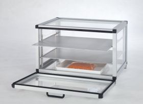 Rangka aluminium dengan panel kaca borosilikat 3.3 yang tahan panas, termasuk dua rak dari aluminium, nampan, higrometer, dan desikan, dapat digunakan dengan hingga 13 rak, dapat ditumpuk, dengan pintu yang membuka ke depan.
